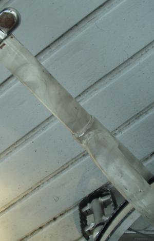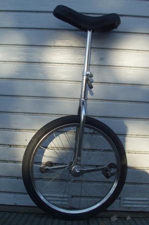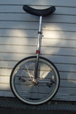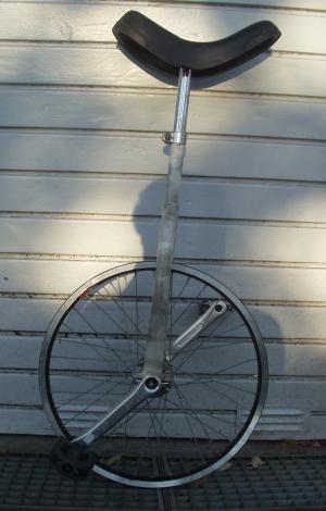 Das Rad hat eine Hohlkammerfelge, die mit einem stabilen Gewebeband ausgelegt ist, damit die Fahrt übers Seil möglichst ohne Hoppler von statten geht. Die Pedalarme sind aus Alu und fast so lang, wie der Durchmesser des Rads, damit die Fahrerin mehr Kontrolle hat. Der Rahmen ist ein ca. 15 Jahre alter Siegmono-Rahmen im Rauch-Design. |