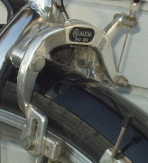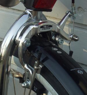 Einfache Alu-Felgenbremse. Die Befestigung erfolgt mit einer Schraube, die durch die Gabel gebohrt wurde und vorne gleich die "Maus" mitträgt. Außerdem ist auch das Schutzblech dran befestigt.