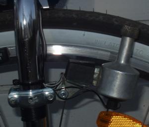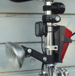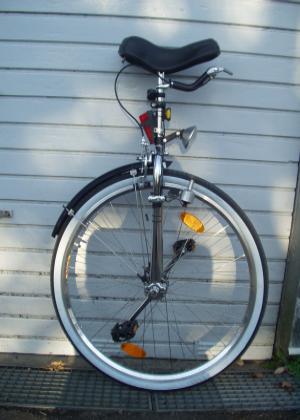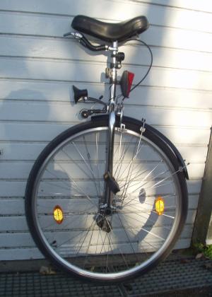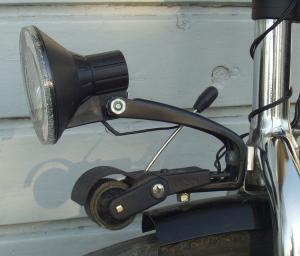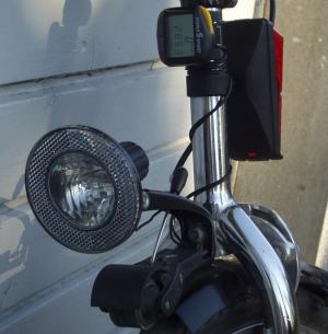 "Maus" Walzendynamo: bereits der zweite, da der erste leider kaputt ging. Unglücklicherweise wird er nicht mehr hergestellt, weil Nabendynamos billiger sind. Er läuft sehr zuverlässig, spritzt aber bei nasser Straße die Beine fürchterlich voll.
