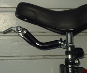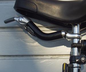 Das schwarze Rohr des Lenkerhörnchens ist drehbar auf die Schelle aufgesteckt, so dass es nicht schräg zur Seite rausragt. Dies wäre bei den einfachen Lenkerhörnchen der Fall.